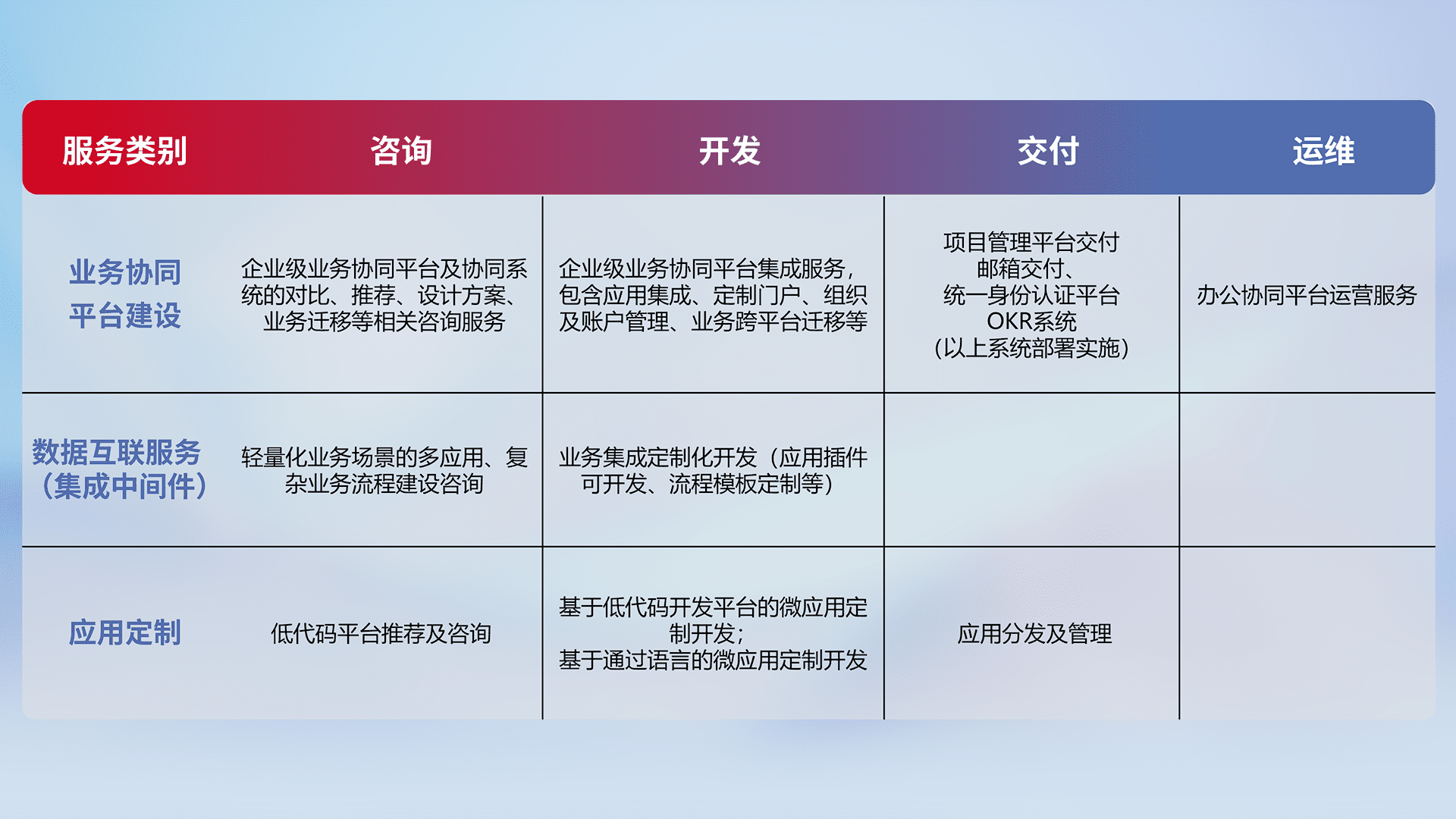 针对钉钉、、、、企微、、、IDaas等平台级产品提供产品的规划、、方案、、交付、、定制化开发等服务,,实现如统一协同办公、、、智能客户服务、、、、混合会议管理、、、智能数据查询、、等业务场景,,实现数字化转型。。。。